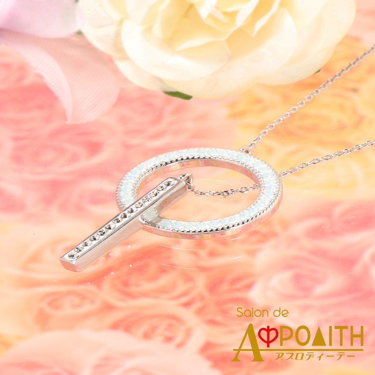 サークル部分はホワイトオパール、スティック部分はクリスタルのストーンを飾ったラリアットネックレスです。