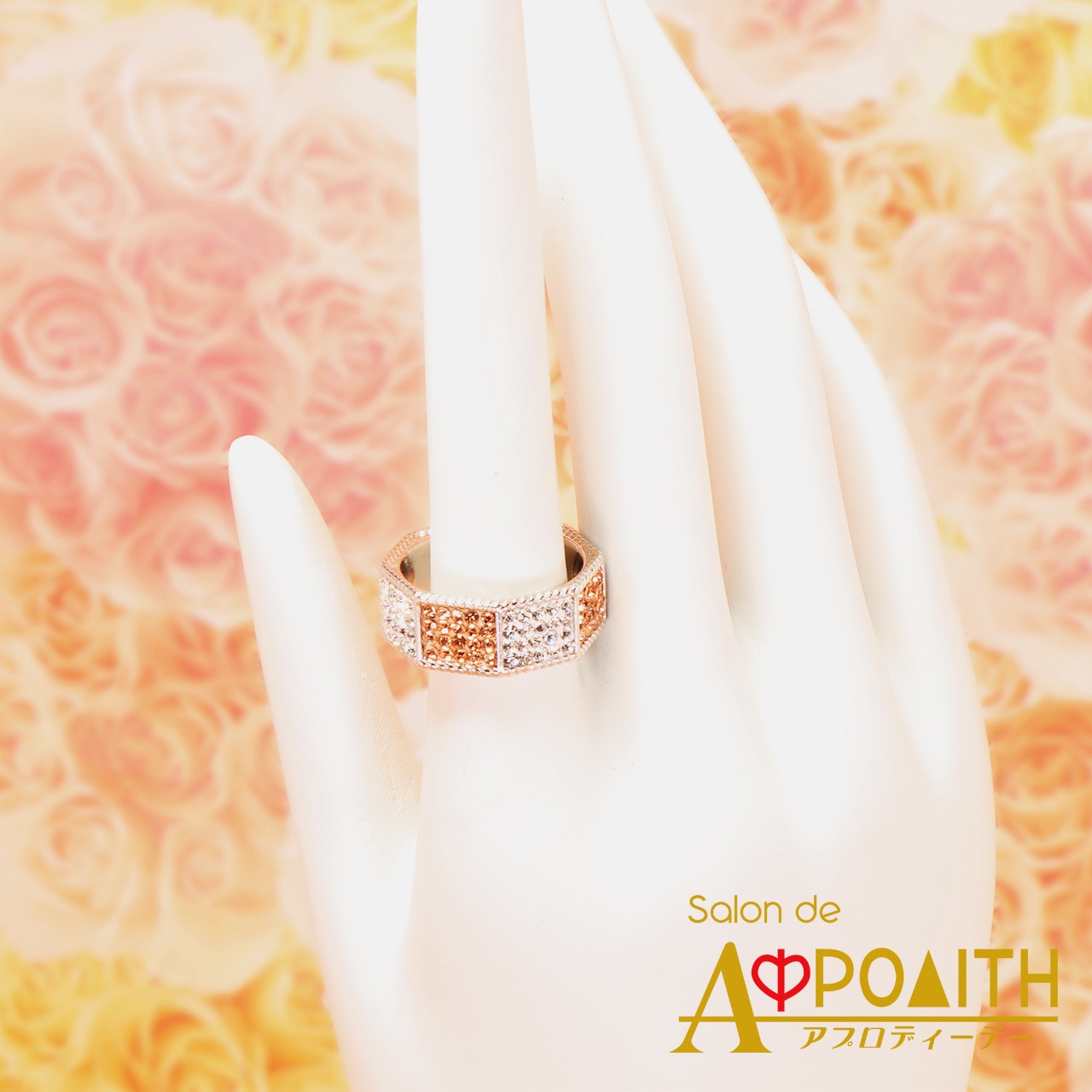 淡いピーチとクリスタルのカラーリングが、指元を華やかに演出します。