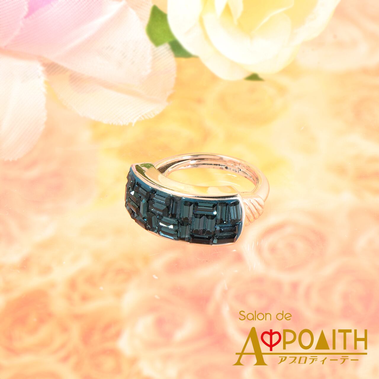 モンタナカラーの大粒スワロフスキーストーンが飾られた、存在感を放つ指輪です。