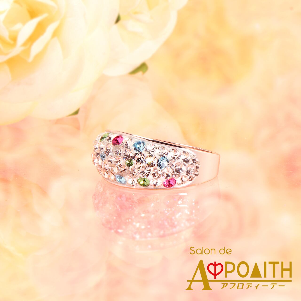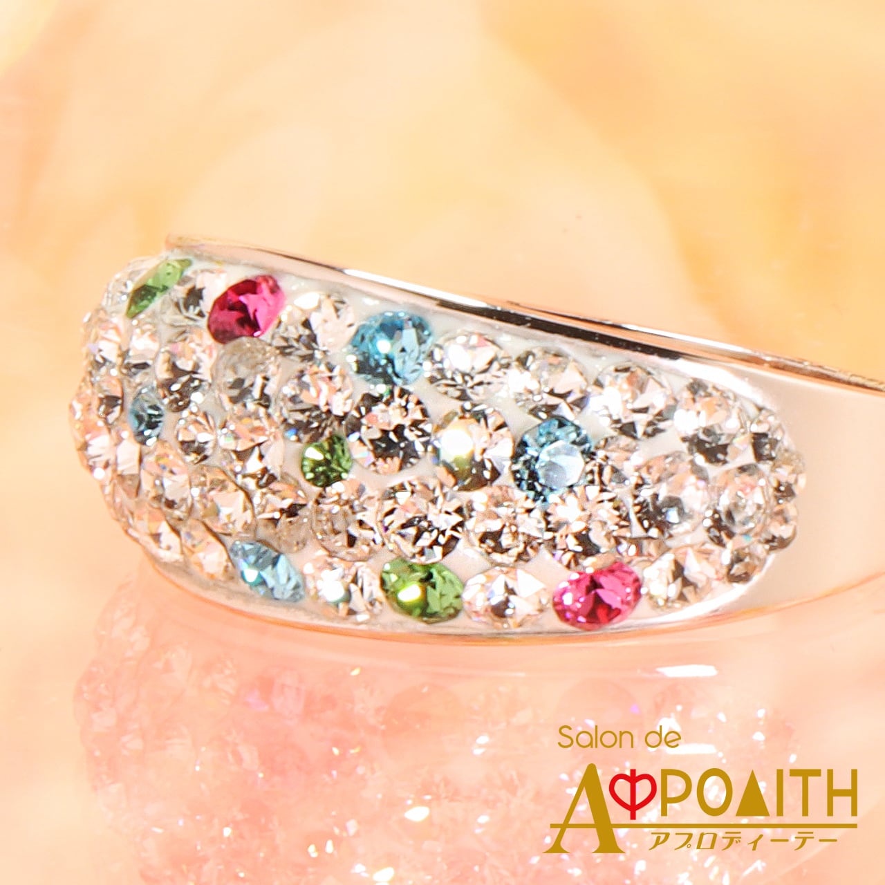 幅広のリングに惜しみなくストーンを敷き詰めた、ゴージャスな指輪です。(最広部:約10mm)